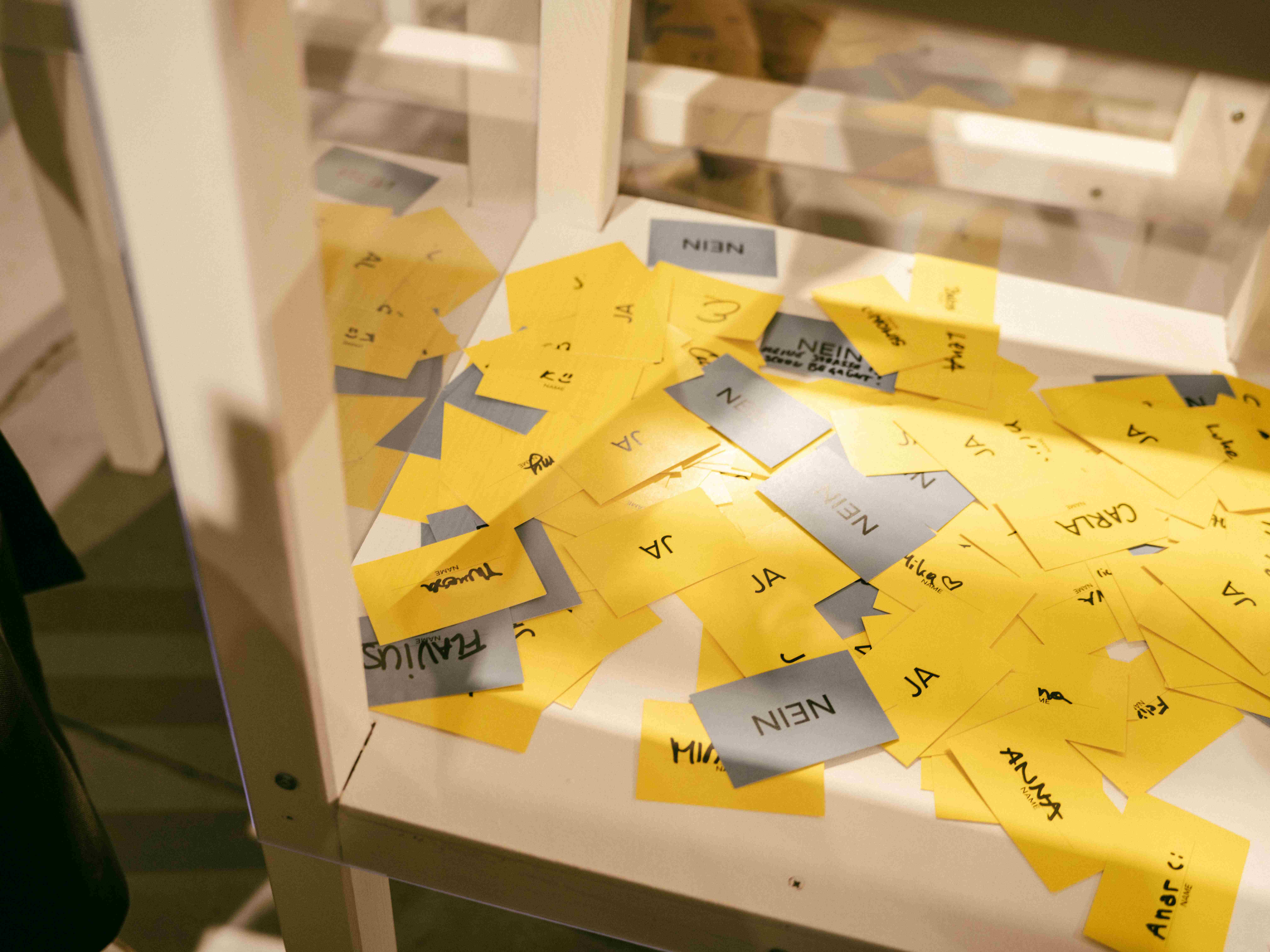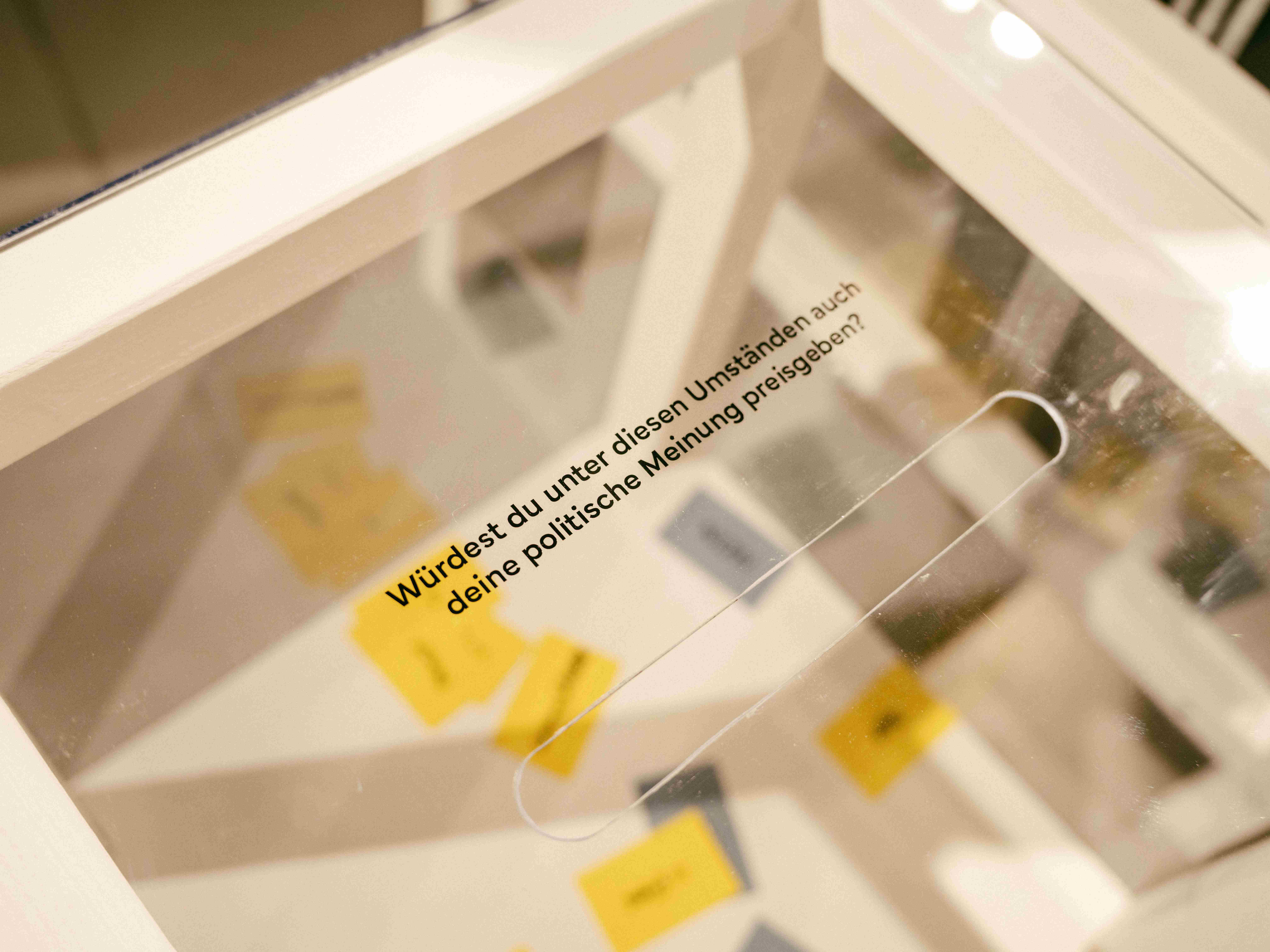 Inmitten unserer Demokratie steht das Wahlgeheimnis: Du darfst wählen, frei von Druck, Urteil oder Beobachtung. Doch was passiert, wenn dieser Schutz verschwindet? Die gläserne Wahlkabine zeigt genau das — eine vermeintlich vertraute Form, entkernt von ihrer wichtigsten Funktion: der Unsichtbarkeit. Plötzlich denkt man nicht mehr nur an die eigene Meinung, sondern an die möglichen Reaktionen anderer. Diese Installation stellt die Frage: Wie würde die Demokratie verletzt werden, wenn die persönliche Wahl offen gelegt wird? Nicht nur in autoritären Systemen, sondern auch in familiären Kreisen kann politischer Druck subtil wirken. Die gläserne Wahlkabine macht das sichtbar. Sie zeigt: Demokratie lebt vom Recht auf eine freie, unbeobachtete Stimme. Ein Raum, der durchsichtiger nicht sein könnte — und gerade deshalb beengt.