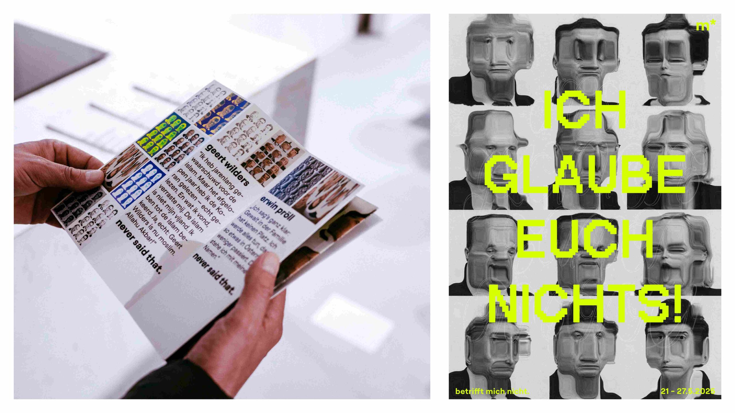 Im politischen Kontext tendieren vor allem rechtspopulistische & rechtsextreme „Bubbles“ dazu, KI- und Deepfake-Technologien zur Manipulation politischer Inhalte und Täuschung von Rezipient*innen auszunutzen. Für sie ist diese Technologie ein gezielt eingesetztes Medium zur Verbreitung von Unwahrheiten und Verschwörungserzählungen – mit dem Ziel, demokratische Institutionen zu delegitimieren, Rezipient*innen gezielt zu emotionalisieren und den öffentlichen Diskurs durch Desinformation zu verzerren. In der Videoinstallation „Ich glaube euch nichts“ wird ihre Waffe gegen sie gewendet, nicht als stumpfe Retourkutsche, sondern als offene Aufklärung und satirische Kritik. Politiker*innen treffen in den dargestellten Deepfakes Aussagen, die ihren bekannten Überzeugungen widersprechen. Einerseits soll dadurch veranschaulicht werden, dass die scheinbare Authentizität audiovisueller Darstellungen heute zunehmend infrage gestellt werden muss, andererseits spielt die Installation mit Übertreibungen, verdrehten Weltbildern und der Freiheit personenbezogene Erwartungen gezielt zu brechen. Ergänzt wurde die Installation durch ein gestaltetes Booklet, das sich zu einem Poster auffalten lässt – als plakative Zusammenfassung und zum Mitnehmen des Projekts.