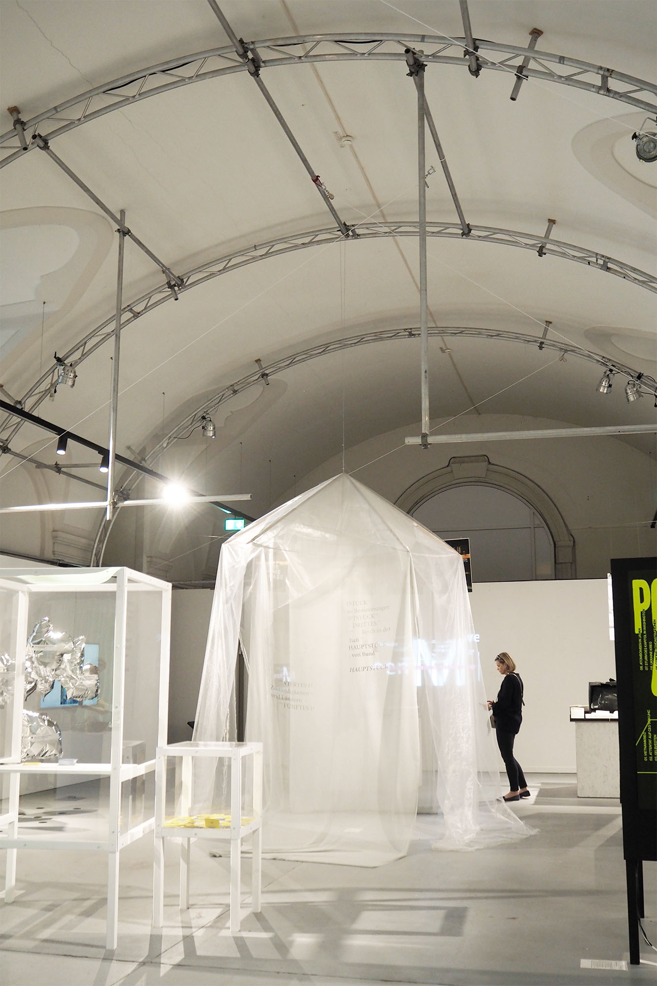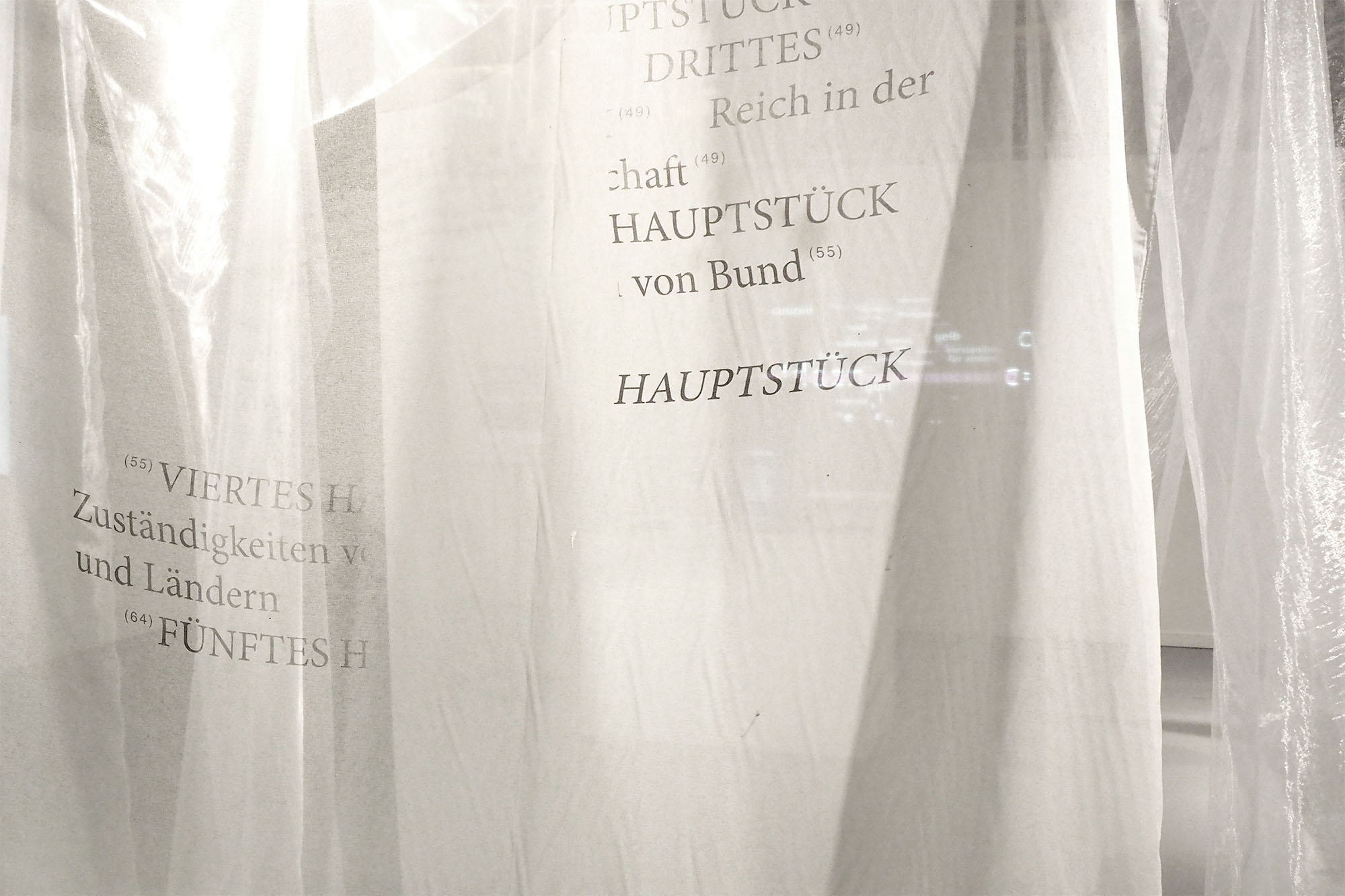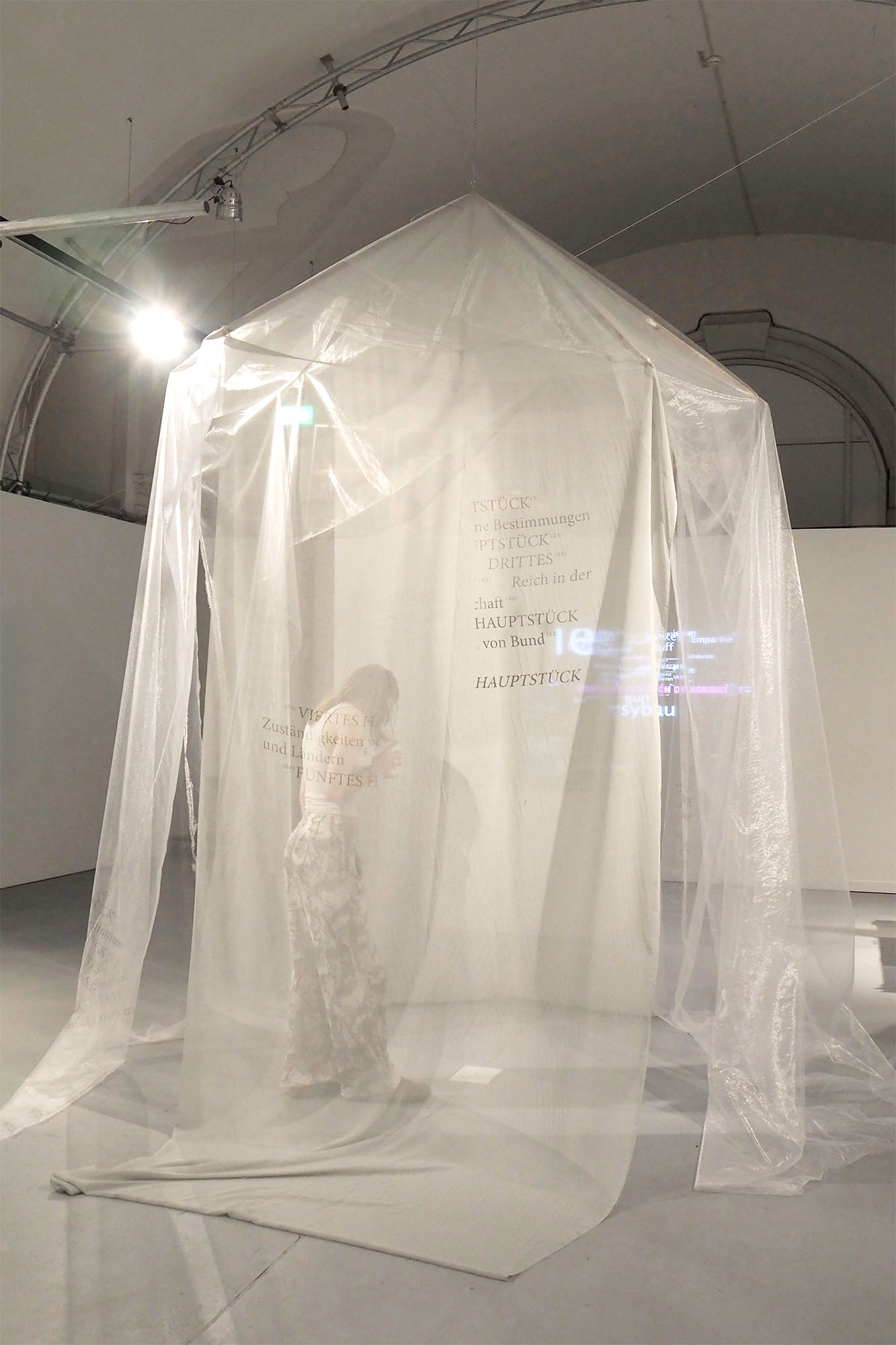 Schützt dich, bewegt sich mit, ist transparent, fühlst dich nicht eingeengt. Eine hängende Installation, bestehend aus „Schirmgerüst“ aus Weichholz, überzogen mit bedrucktem Textil. Sie kann sich aber auch umdrehen, wie ein Schirm in einem Sturm; wir haben sie erfunden um uns zu schützen. Mit Lisa Glas