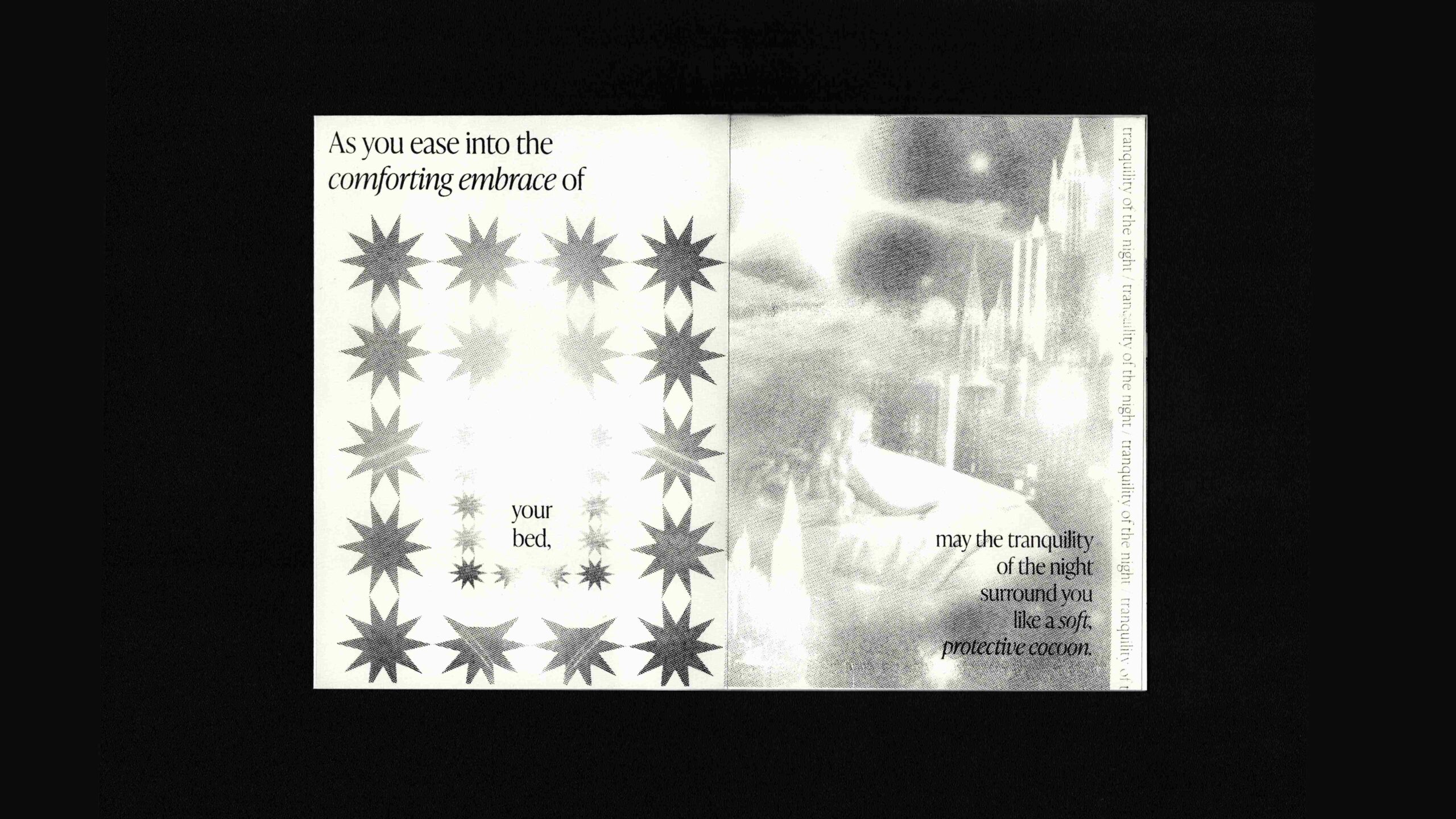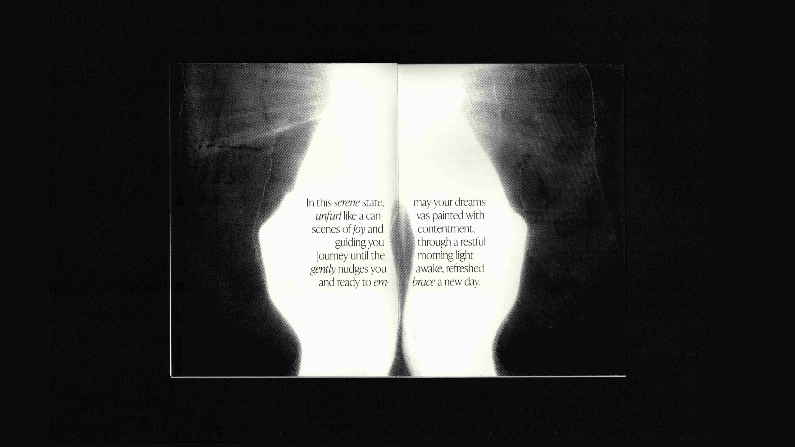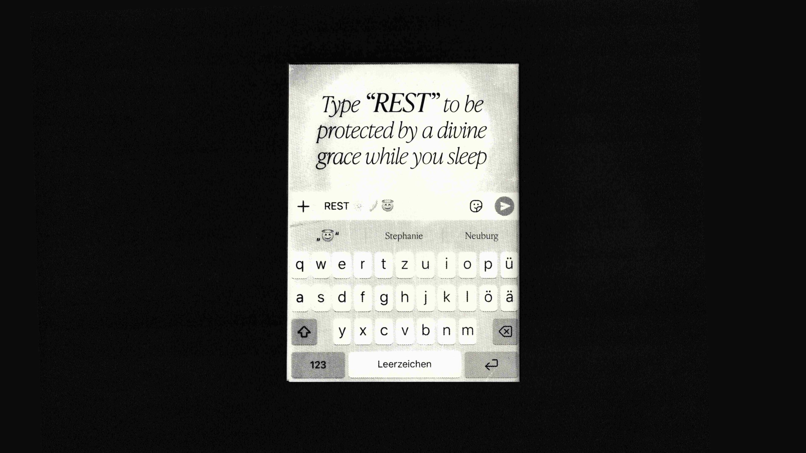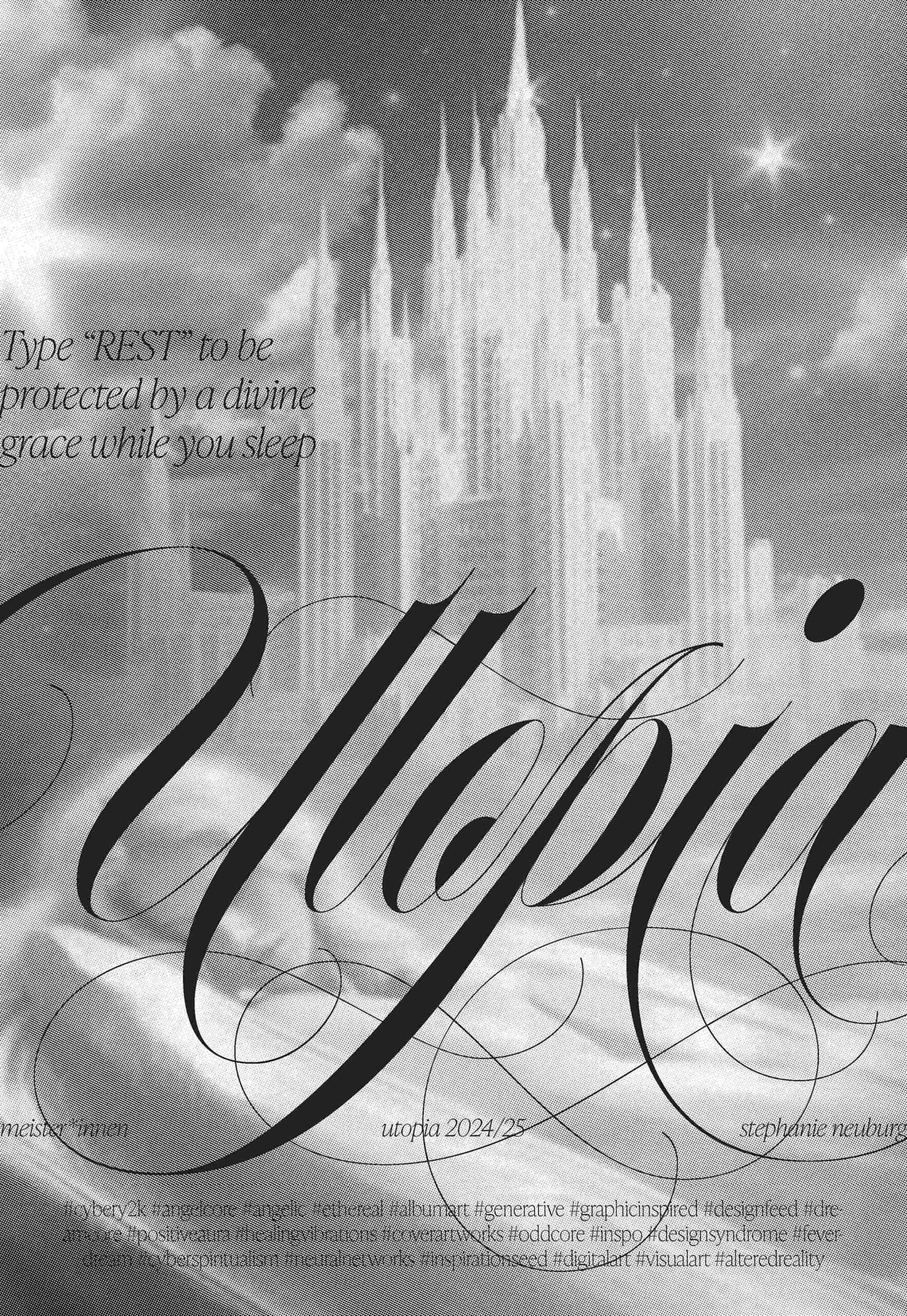Als Basis dienten KI-generierte Bilder eines Instagram Posts über ‘Eternal Bliss’: Dabei befindet sich in der Caption ein scheinbar ebenso generiertes Gedicht - am Ende wird dazu aufgerufen, ‘REST’ in die Kommentare zu tippen, um den Post für den Alghorithmus zu pushen. Die spielerische Auseinandersetzung vom Digitalen in das Analoge steht im Fokus.
