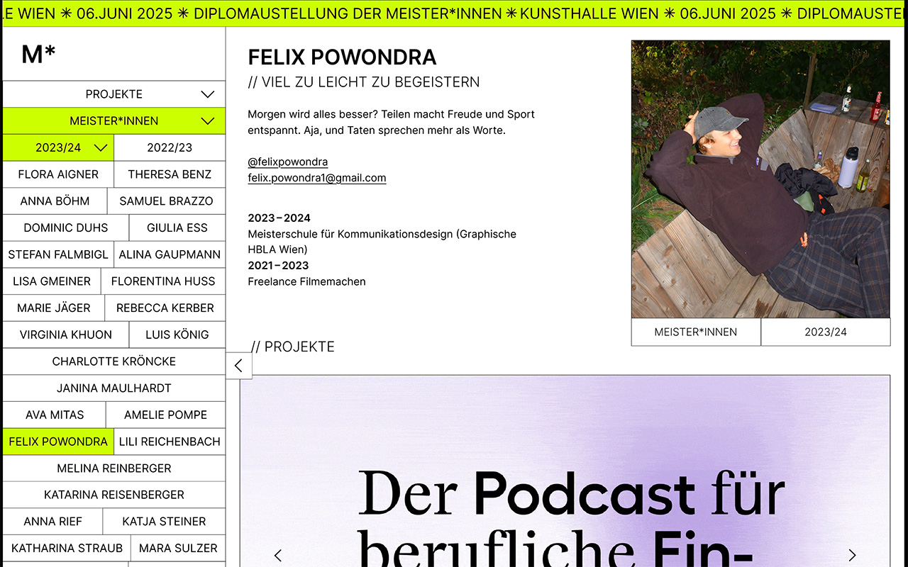 Visuals der einzelnen Meister*innen werden räumlich neben- und zueinander gestellt, bilden ein wildes Drunter und Drüber, geben Einblick was man bei der Ausstellung zu bekommt und was die Projekte für eine Bandbreite zu bieten haben. Mit Lucie Dieterich, Spejra Juliane