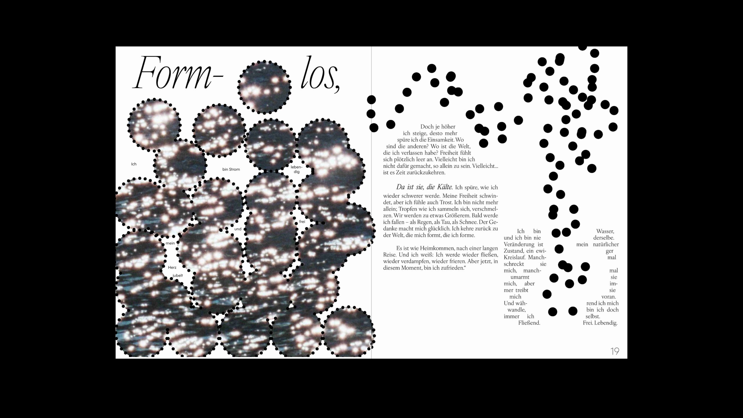 Wie fühlt sich Wasser? Ist es für die Atome befreiend, wenn das Eis schmilzt? Fühlt sich das Gas verzweifelt, wenn es keinen Halt hat? In der Arbeit setze ich mich mit den emotionalen Monolog von Wasser auseinander, während es seine Aggregatzustände verändert.