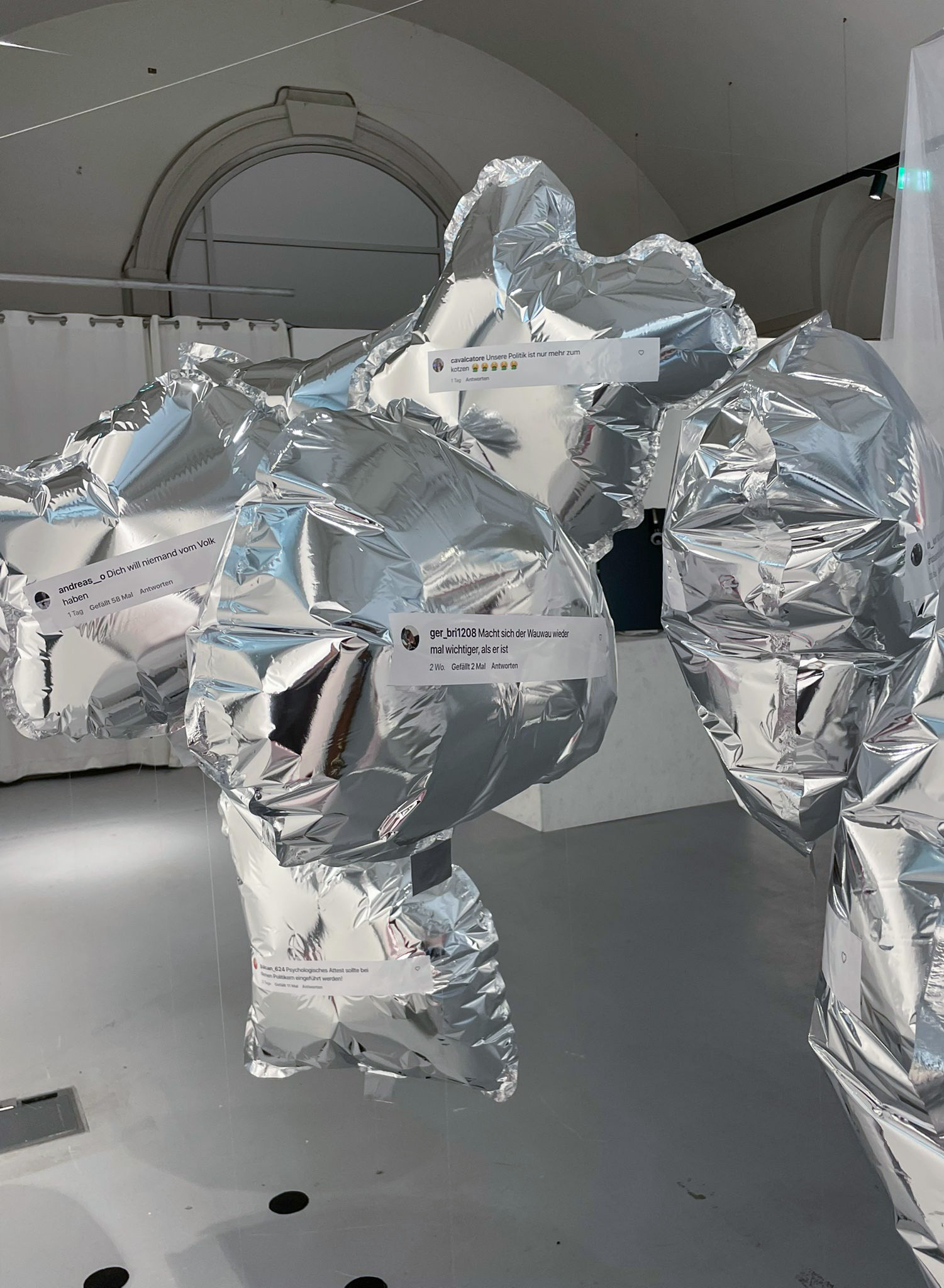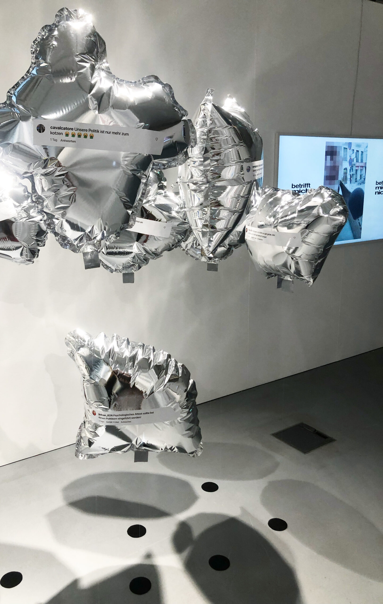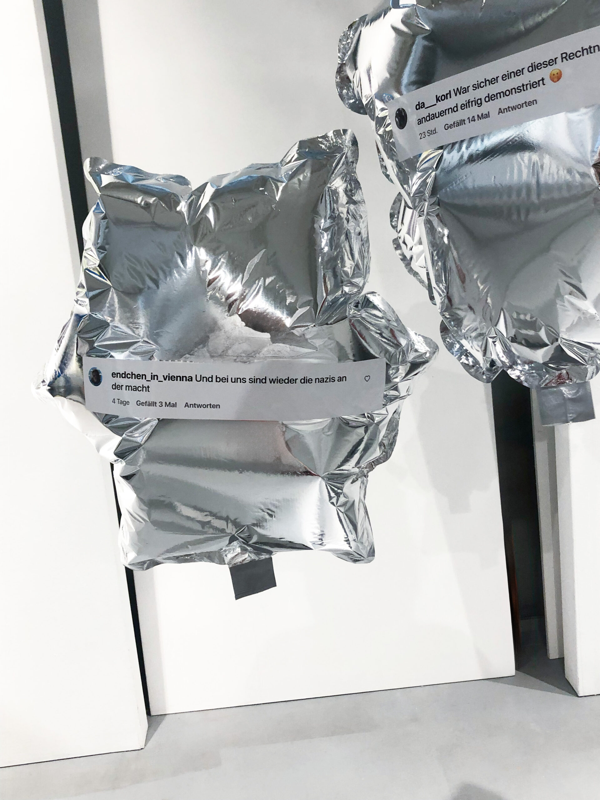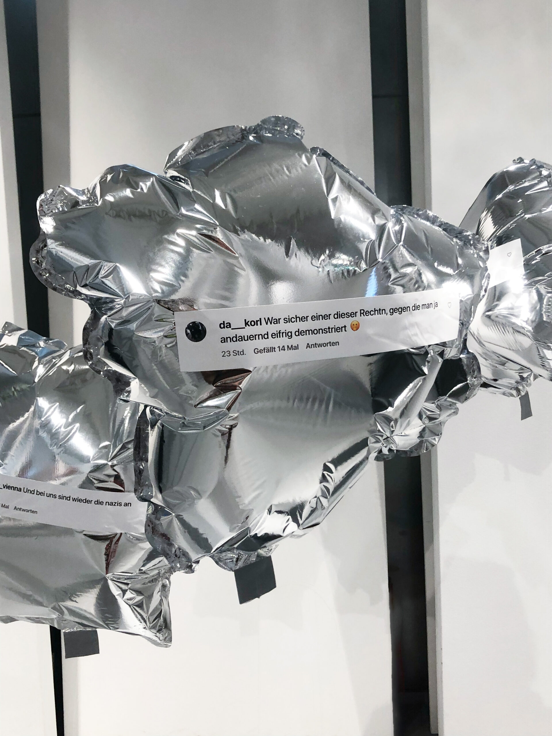 Diese Arbeit zeigt Social Media als luftleeren, orientierungslosen Raum – laut, fragmentiert, emotional. Zehn eigens gestaltet und hergestellte Heliumballons aus Mylarfolie hängen auf Augenhöhe, an Nylonfäden befestigt, dicht im Raum verteilt. Jeder trägt einen Originalkommentar von österreichischen Accounts wie derStandard.at, ZIB (ORF), HEUTE oder oe24 – gesammelt zwischen Jänner bis April 2025, ausschließlich zu innenpolitischen Themen. Die scheinbar zusammenhanglosen Aussagen sind bewusst gewählt: Sie spiegeln nicht Dialog, sondern parallele Monologe – typische Symptome digitaler Echokammern. Es geht nicht um ganze Diskurse, sondern um Momentaufnahmen einer oft rohen, polarisierten Stimmungslage im Netz. Die Kommentare stehen stellvertretend für Frust, Misstrauen und das Gefühl politischer Ohnmacht – besonders im Kontext der Unsicherheit nach der Nationalratswahl 2025.