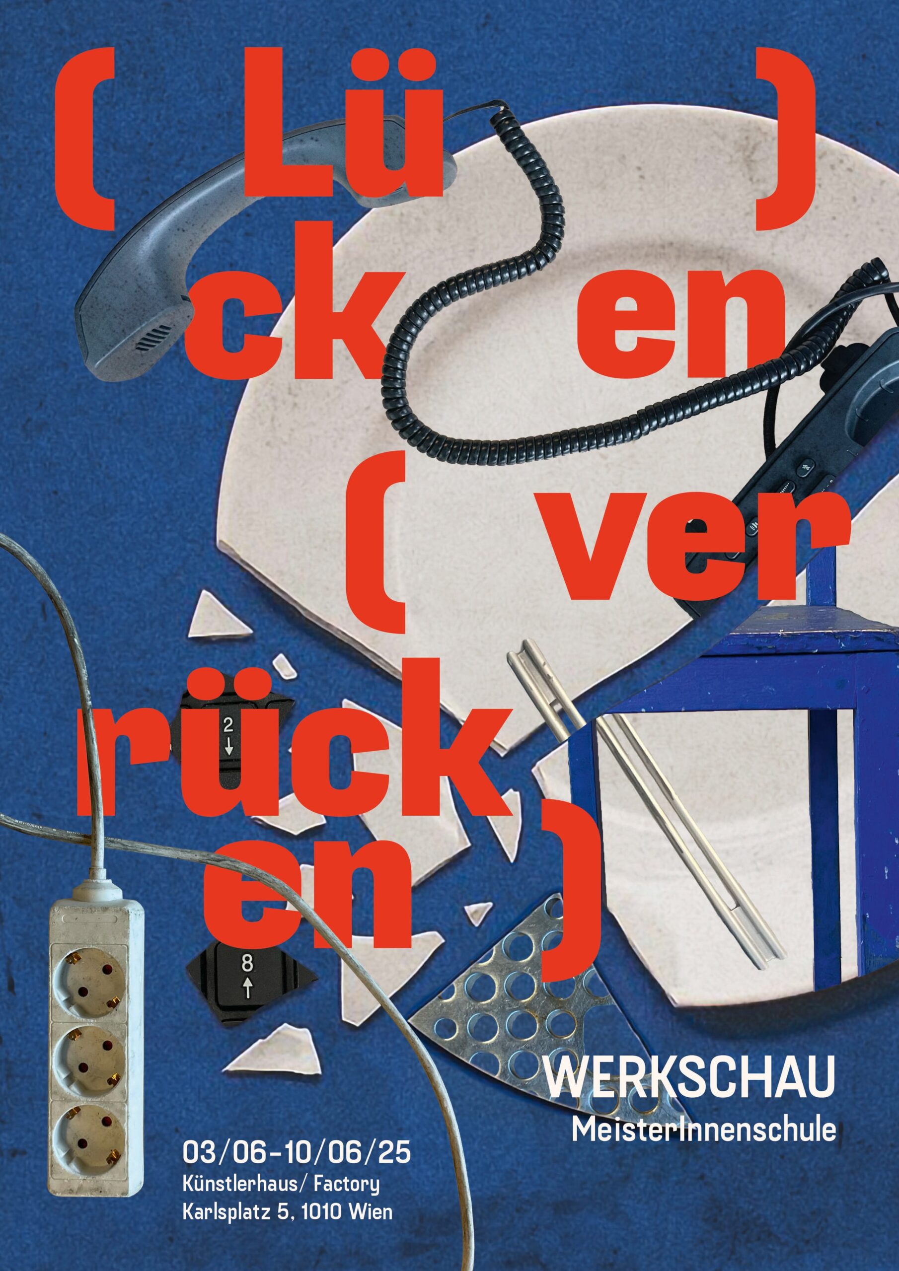 Das Diplomplakat bewirbt die ausgestellten Abschlussarbeiten unter dem Format „Werkschau der Meisterschule“ und macht deren gestalterisches Potenzial sichtbar. Unter dem Titel „Lücken verrücken“ verweist es auf das kreative Prinzip, Bestehendes neu zu denken, zu verschieben und zu hinterfragen. Visuell wurde mit eingescannten analogen Objekten aus der Meisterklasse gearbeitet – einem Raum, in dem viele Ideen ihren Ursprung haben. Die Gegenstände symbolisieren zentrale Elemente des gestalterischen Prozesses und stehen für die enge Verbindung von Materialität, Denken und Design. Konzept und Gestaltung entstanden in Zusammenarbeit mit Lisa Zartler.
