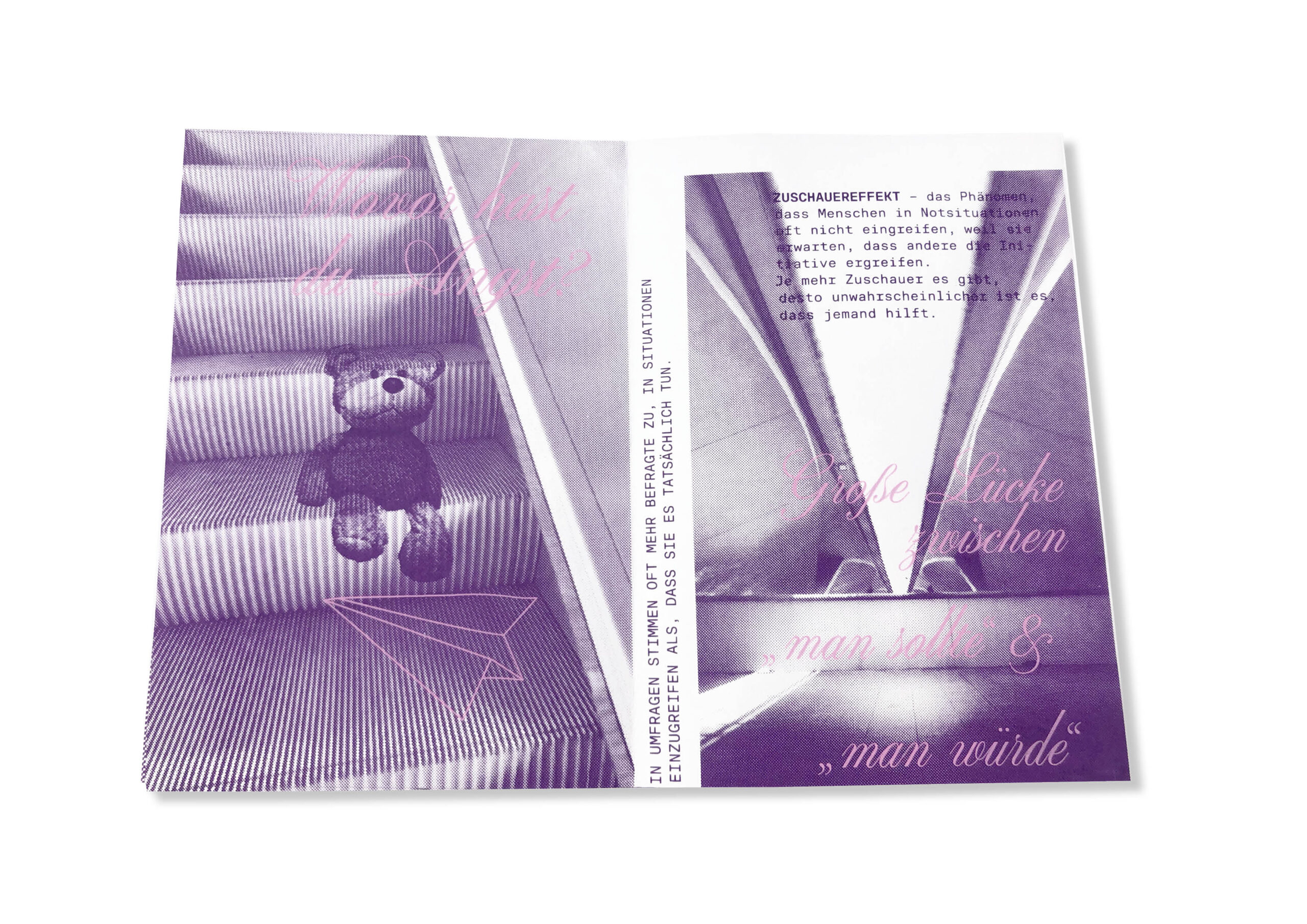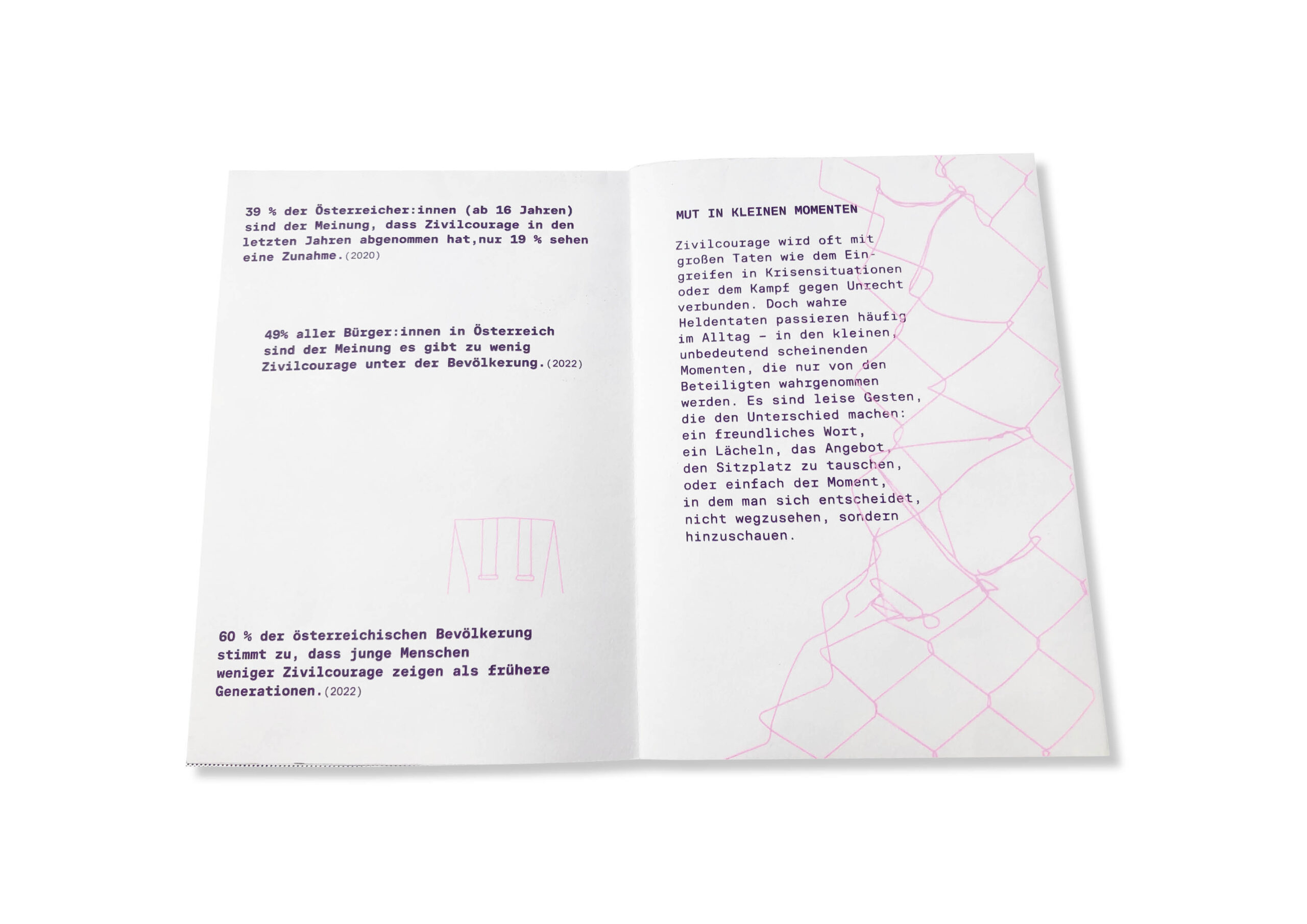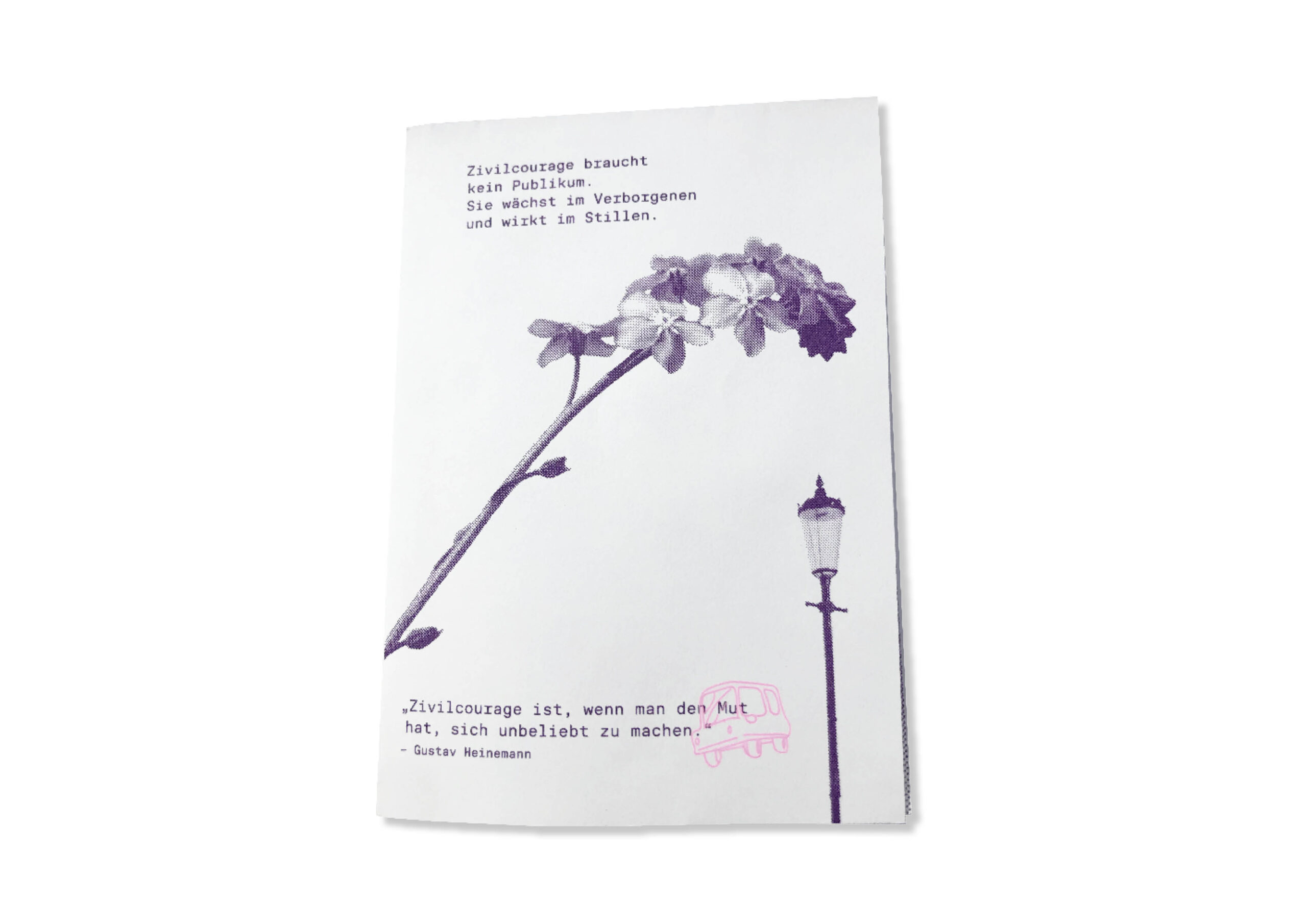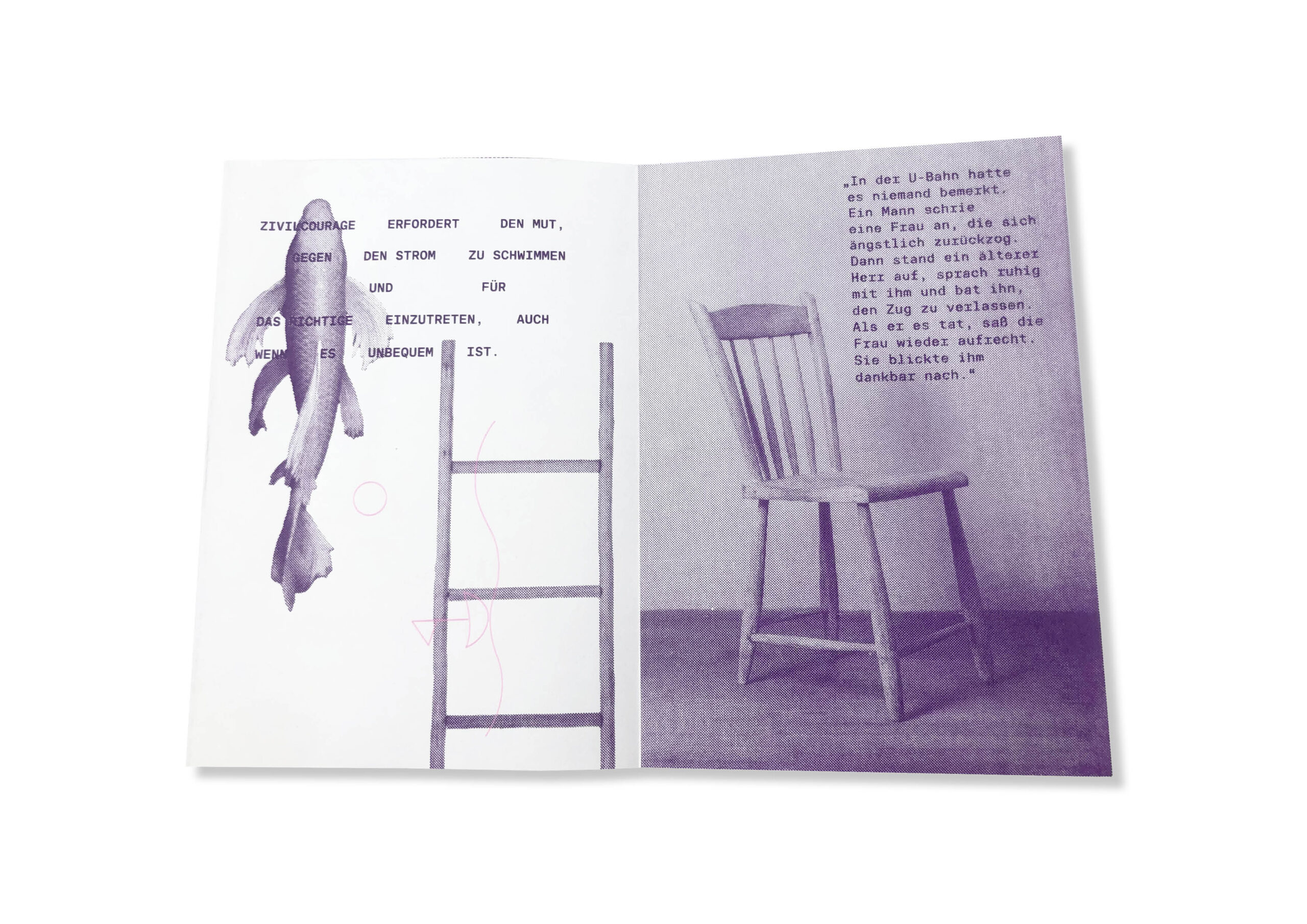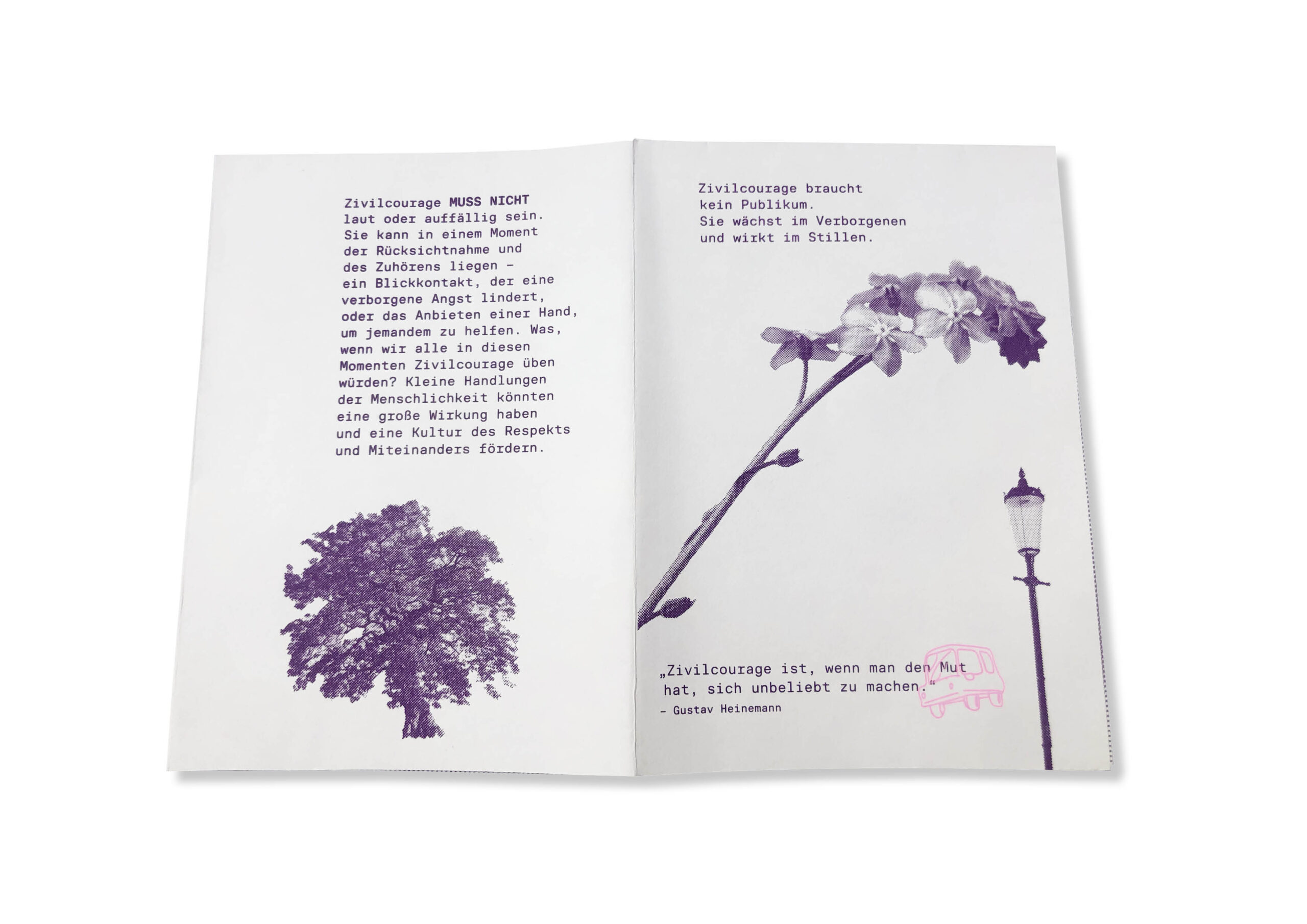 Dieses Zine beschäftigt sich in kollagenartiger und illustrativer Form mit dem Thema Zivilcourage. Durch die Kombination aus Zitaten, Definitionen, erzählenden Elementen, Fakten und einem reflektierenden Text beleuchtet es heldenhaftes Verhalten als zentrales Element mutigen Handelns.