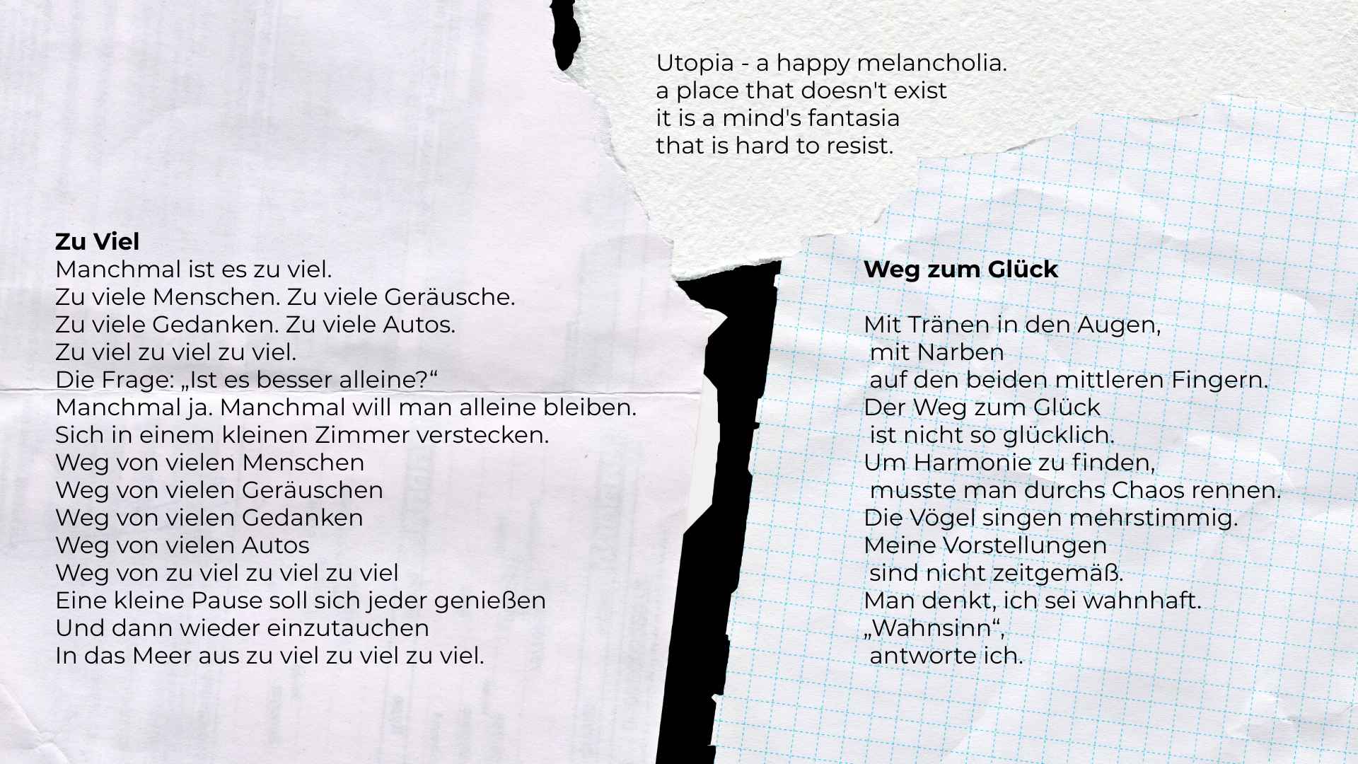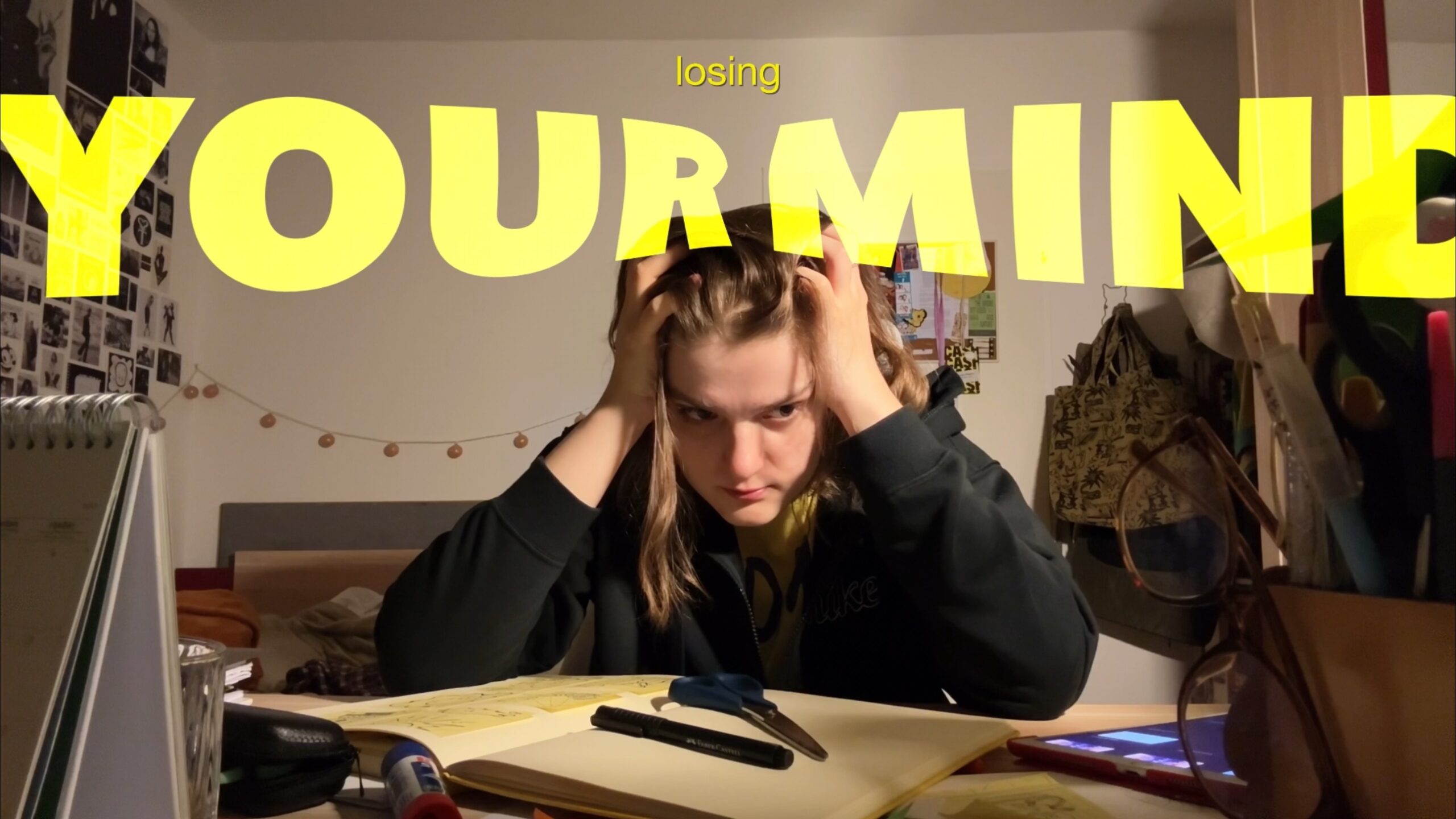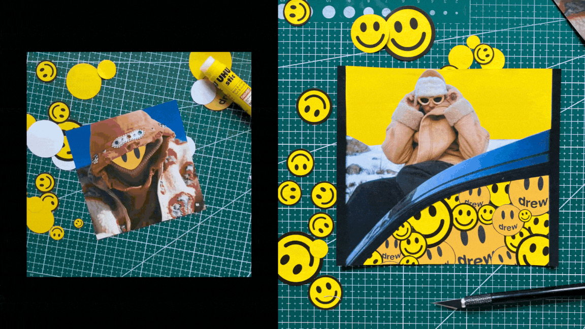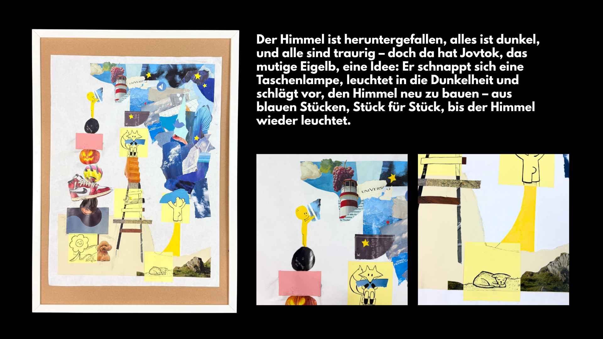 Diese Arbeiten sind unabhängig vom Unterricht während des Schuljahres entstanden und beschäftigen sich mit fortlaufenden Themen, Figuren und Ausdrucksformen jenseits der Kursstruktur. Zu sehen sind Mixed-Media-Collagen, Lyrik, Skizzen und visuelle Experimente – von popkulturell inspirierten Werken mit Künstler*innen wie Billie Eilish, Justin Bieber, Kendrick Lamar oder Bad Bunny bis hin zu persönlichen Texten und intuitiven Collagen. Diese Sektion zeigt einen spielerischen und spontanen Schaffensprozess, in dem sich verschiedene Formen und Impulse frei verbinden.