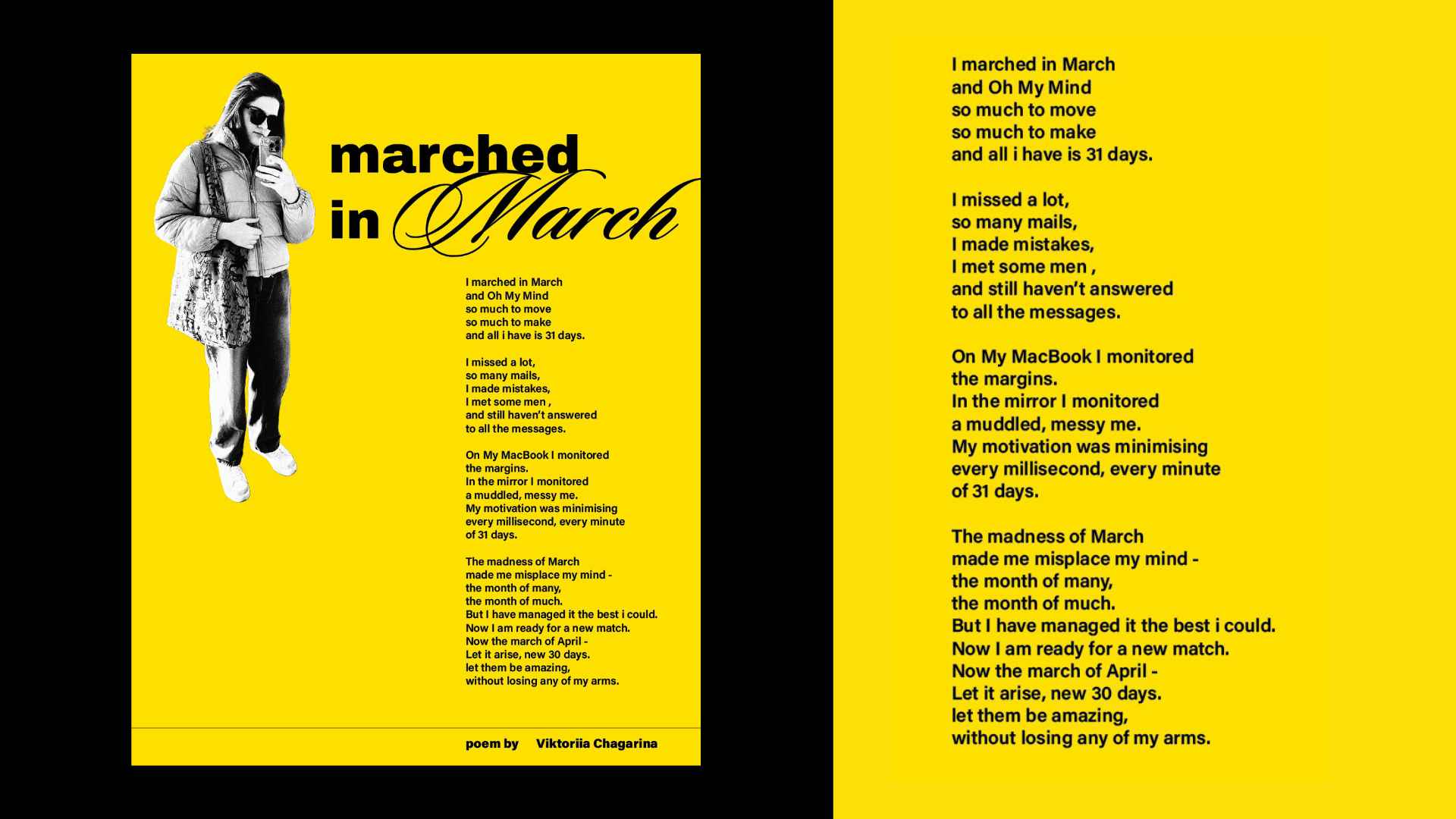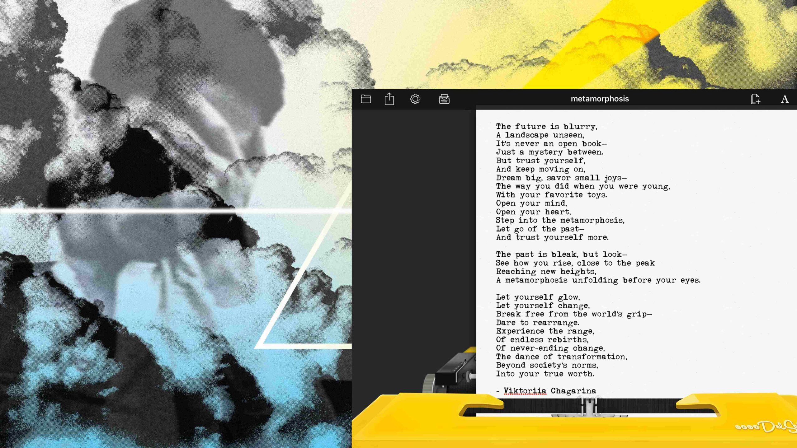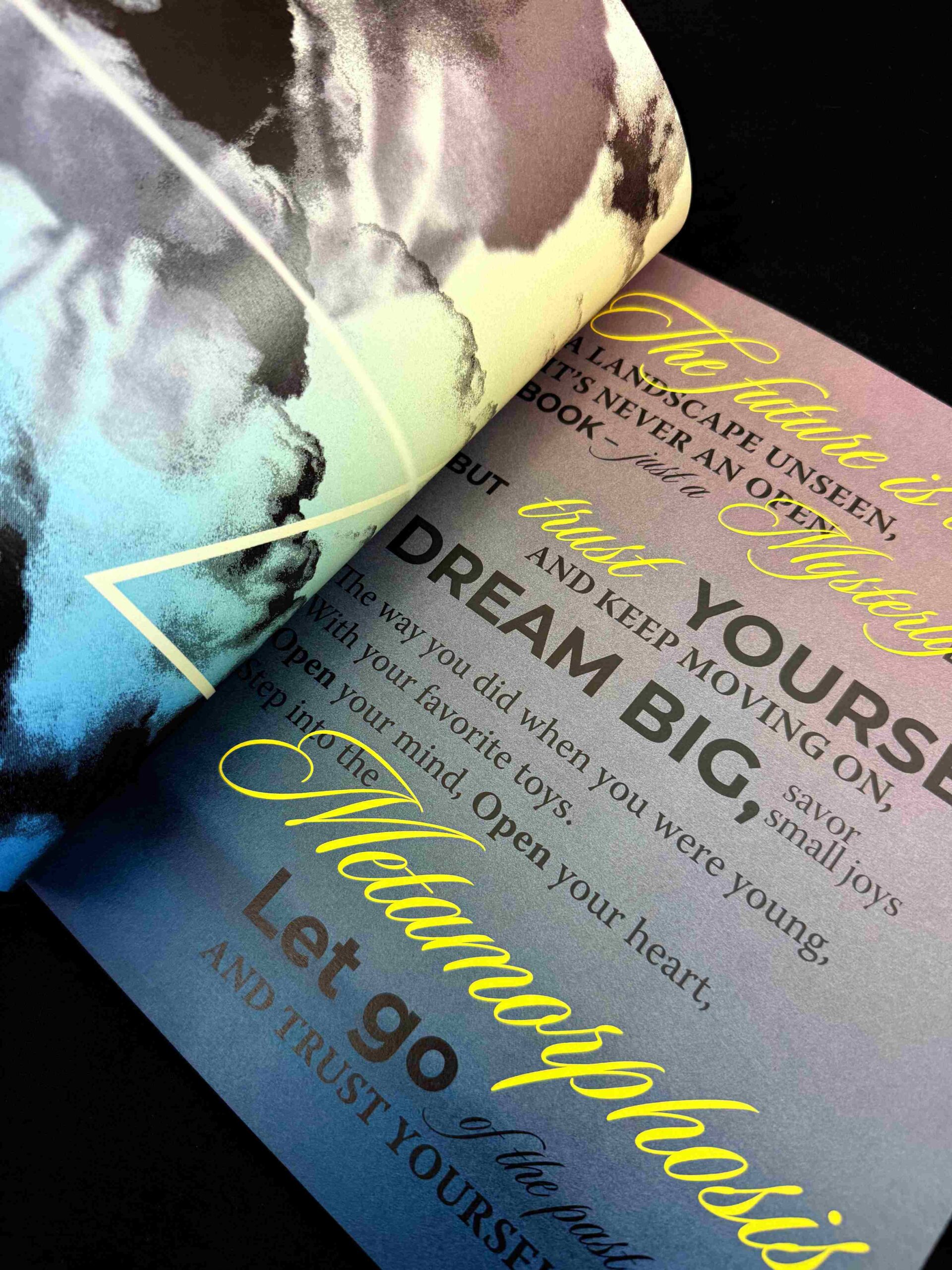 Im Druck-Unterricht entstanden, beschäftigt sich dieses Magazin-Layout mit dem Thema Metamorphose – durch eigene Lyrik, vielschichtige Bildsprache und ausdrucksstarke Typografie. Verschwommene Motive und symbolisches Licht spiegeln den Übergang von Vergangenheit zu Zukunft und laden zur Reflexion über Wandel, Wachstum und Selbstvertrauen ein.