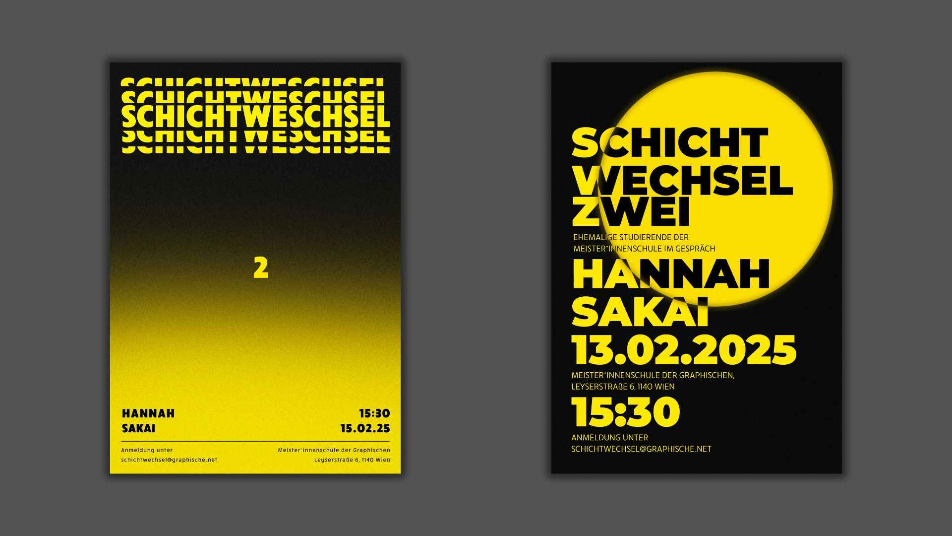 Typografieprojekt im Rahmen des Unterrichts: Gestaltung eines Plakats zu einem Vortrag einer ehemaligen Absolventin. Die Umsetzung setzt auf starke Typografie, reduzierte Farbgebung (Gelb, Schwarz, Weiß) und visuelle Überlagerungen als grafische Interpretation des Themas „Schichtwechsel“.