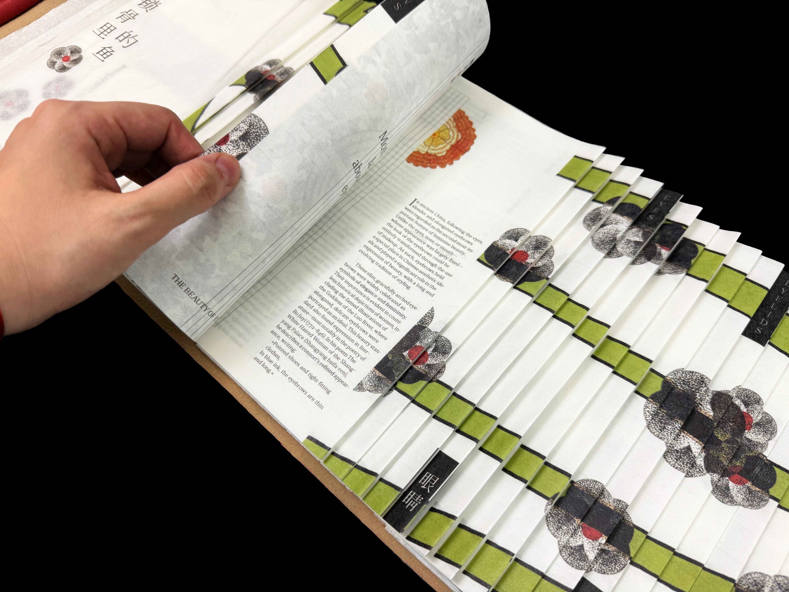 Das Thema entstand durch die Beobachtung eines aktuellen Social-Media-Trends aus China, bei dem extreme Schlankheitsideale wie das Balancieren von Lippenstift auf dem Schlüsselbein oder die sogenannte A4-Taille viral gingen. Die Diplomarbeit untersucht Schönheitsideale in China anhand von zehn Körperteilen und vergleicht historische Vorstellungen mit modernen, insbesondere auf Social Media verbreiteten extremen Schlankheitsidealen. Das Buch ist in Dragon-Scale-Bindung gestaltet und auf zwei Arten dünnem chinesischem Kalligrafiepapier gedruckt.